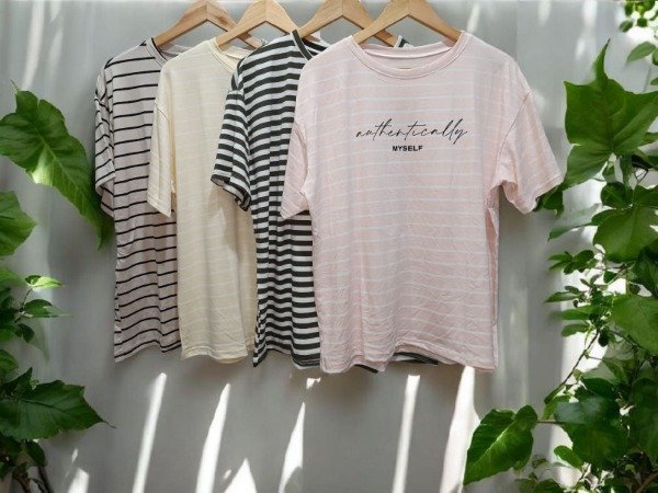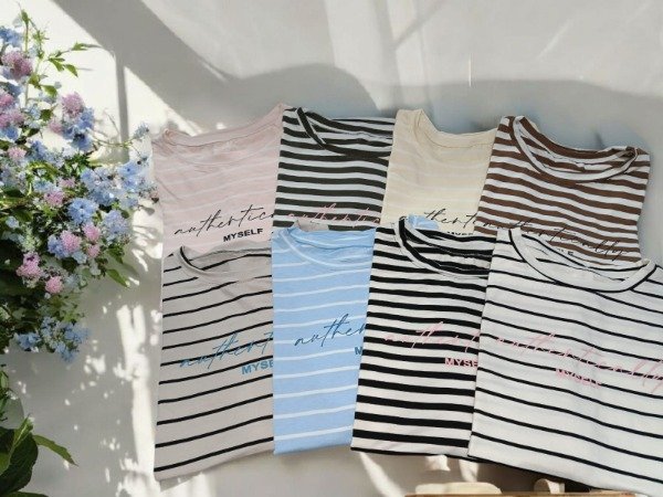 💋 Detalle de líneas rayadas con estampado~ cuello redondo, corte evasse.